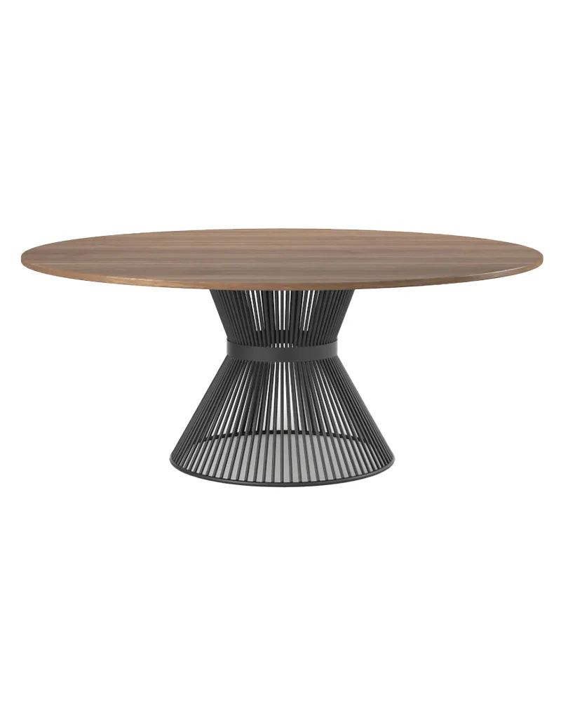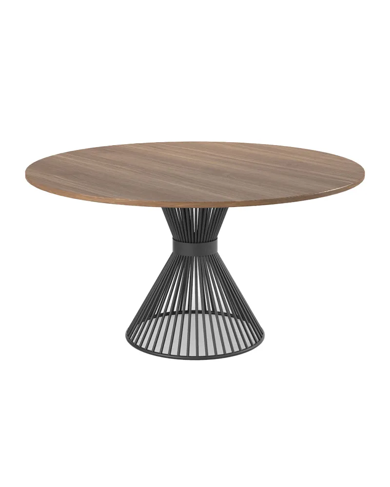 Caliban è un tavolo dal design distintivo, con struttura in tondino Ø 11 mm e anelli di rinforzo in tubo Ø 16×2 mm, dotato di piedini regolabili. Le finiture disponibili abbinate al trattamento a sali di zinco lo rendono perfetto anche per l’esterno. Compatibile con piani in legno o vetro, è disponibile anche in versione MAGNUM per piani di grandi dimensioni fino a Ø 1800 mm.