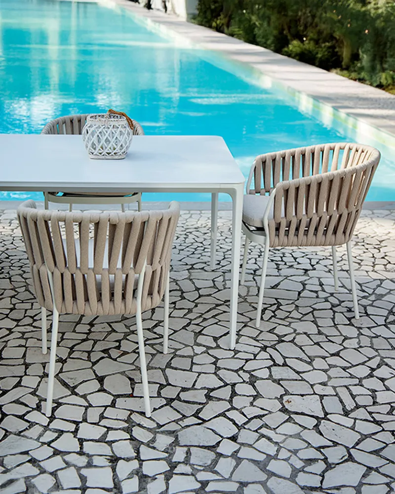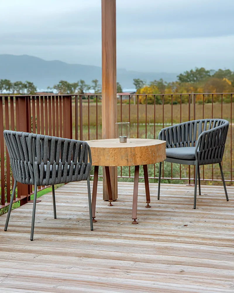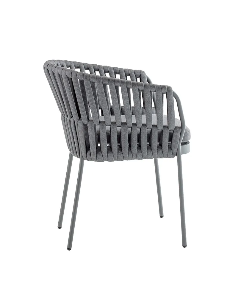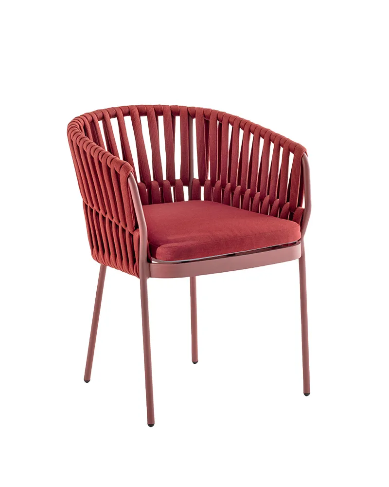 Corallo è una poltroncina impilabile con struttura in alluminio verniciato e schienale rivestito in corda acrilica. Il cuscino sfoderabile la rende confortevole e resistente all’uso quotidiano. Perfetta sia per ambienti esterni che interni, aggiunge stile e comfort a terrazze, bistrot e spazi residenziali moderni.