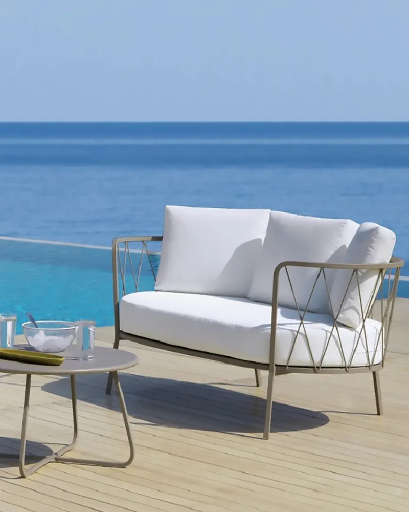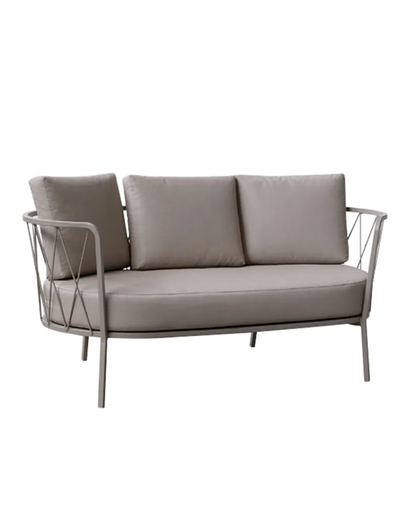Il divano a due posti Daisy si distingue per linee morbide e sinuose, sostenute da una struttura in metallo laccato con trattamento di zincatura anticorrosione e verniciatura Qualicoat. La cuscineria in tessuto acrilico con finitura Teflon è sfoderabile, resistente a muffa e macchie, e progettata per l’uso outdoor professionale. È perfetta per zone outdoor: lounge, terrazze e aree relax.