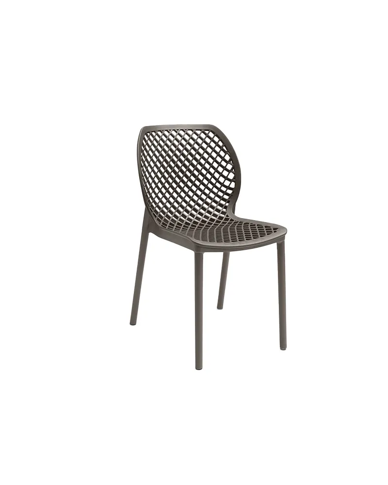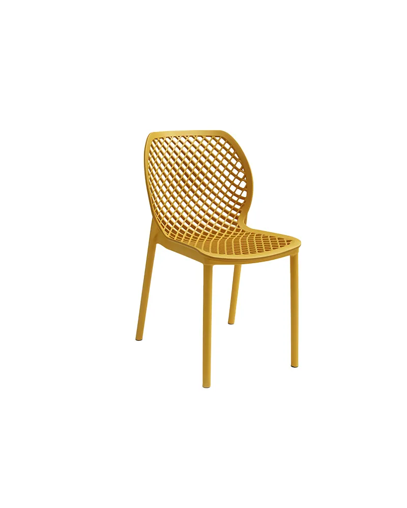 La sedia Elara, monoblocco in polipropilene rinforzato con fibra di vetro, unisce robustezza e praticità. Impilabile e trattata per uso indoor/outdoor, è realizzata con resina 100% riciclabile. Ideale per bar, giardini, spazi contract e aree collettive.