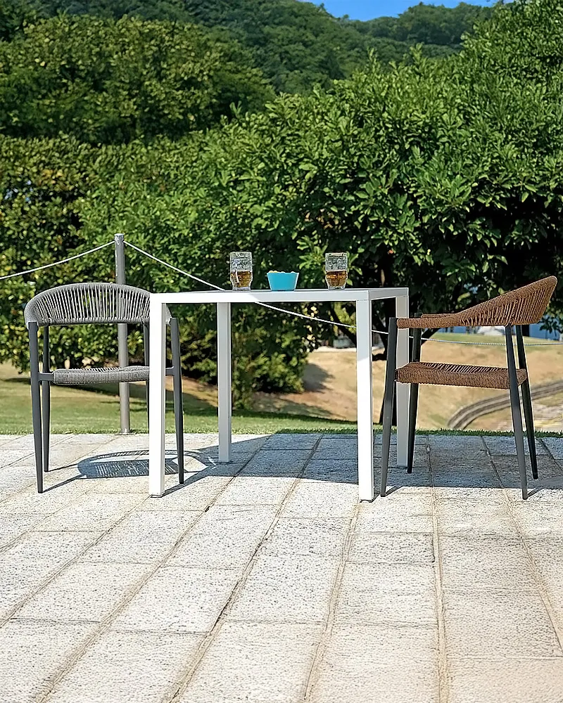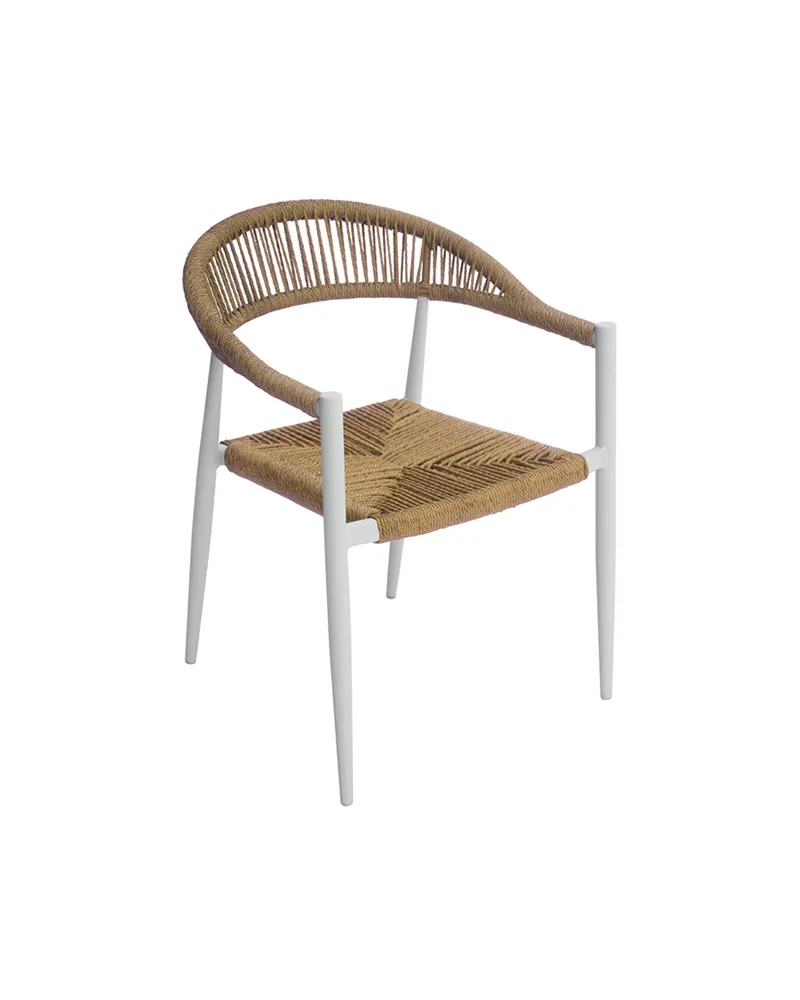 La sedia Elettra è una soluzione contract impilabile con struttura in alluminio e seduta/schienale in twist wicker Ø5 mm. Disponibile con telaio bianco o antracite, abbina leggerezza e resistenza, ideale per bar, ristoranti, dehors e ambienti outdoor dal gusto mediterraneo.