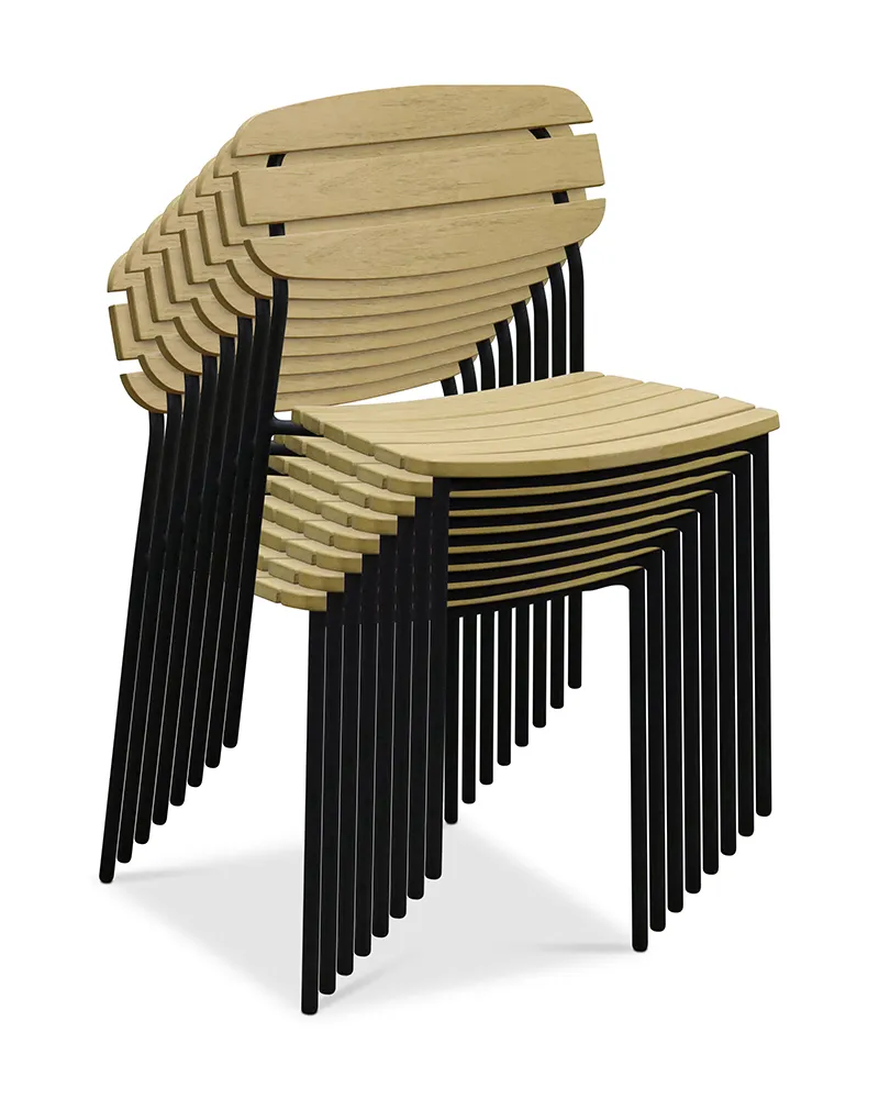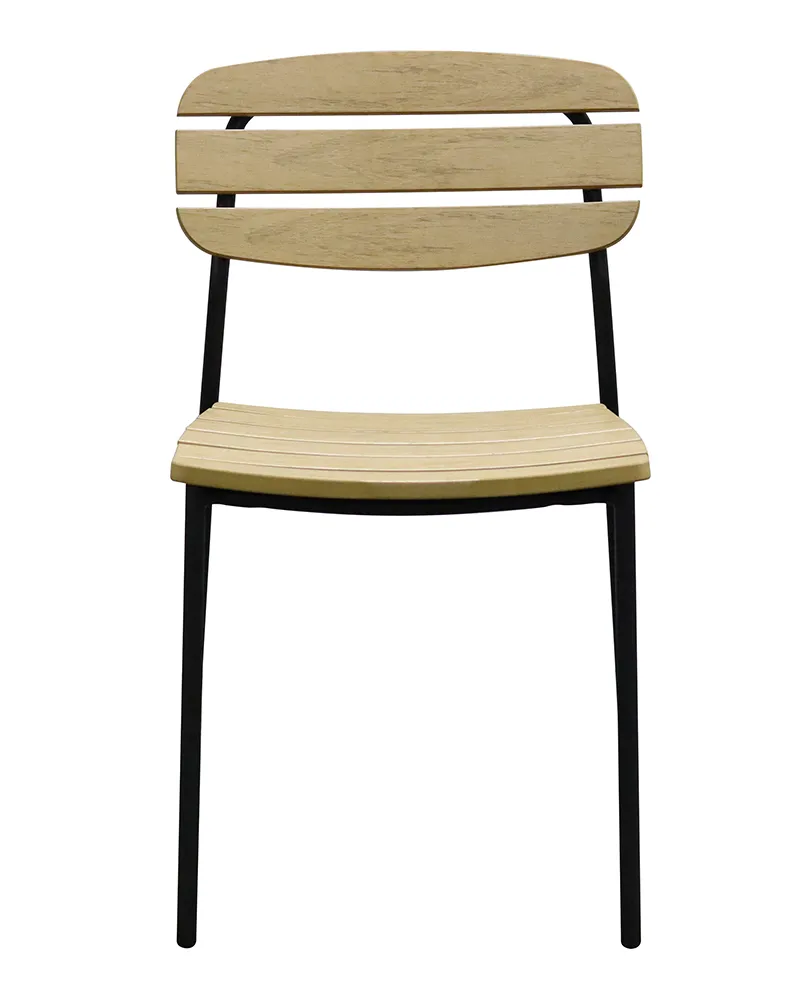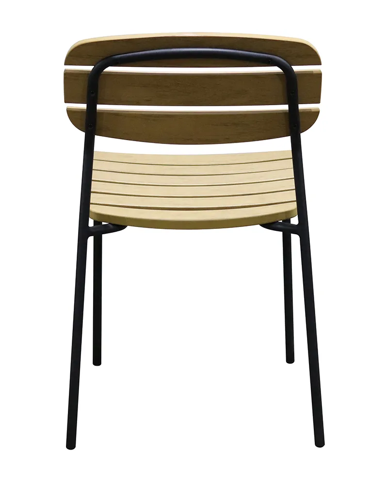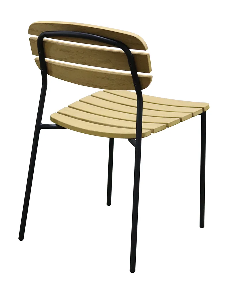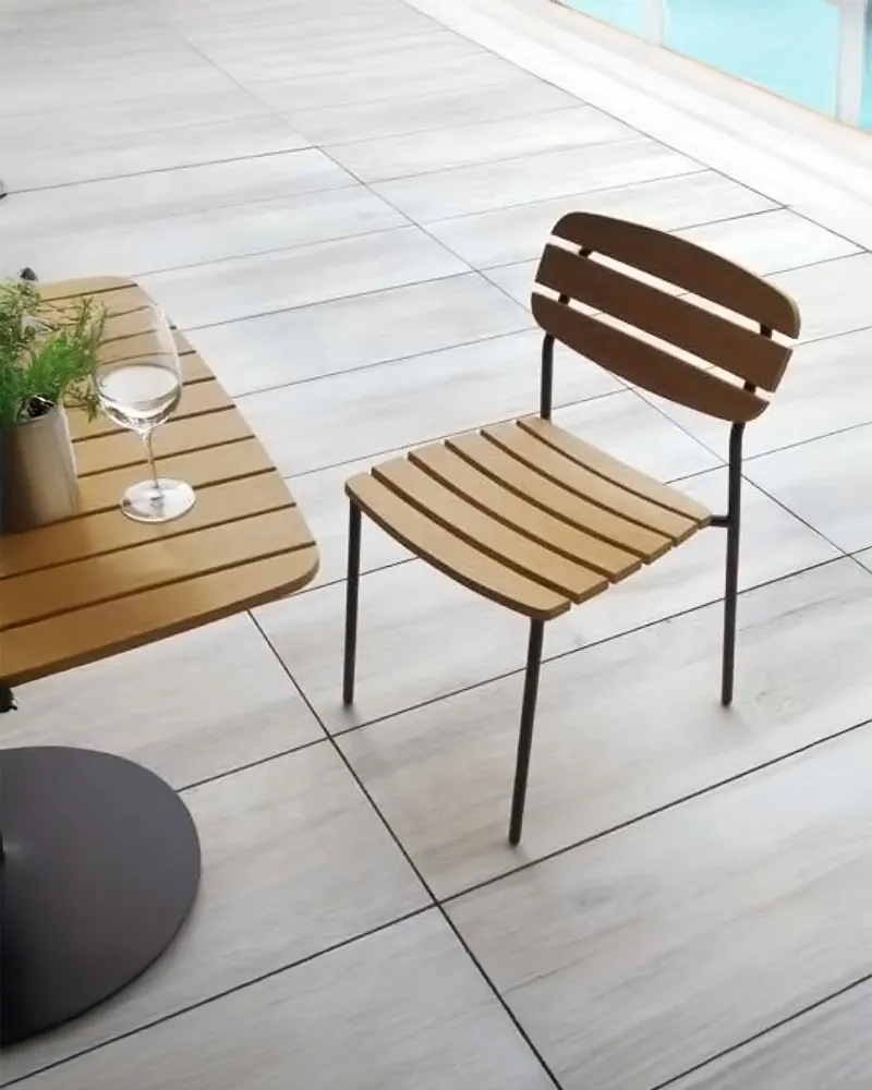 Con struttura in metallo trattato antiruggine e verniciatura a polvere, la sedia Etoile è pensata per durare. Seduta e schienale in resina effetto legno tinta teak offrono comfort e uno stile naturale. È adatta sia a spazi interni che esterni nel settore hospitality.