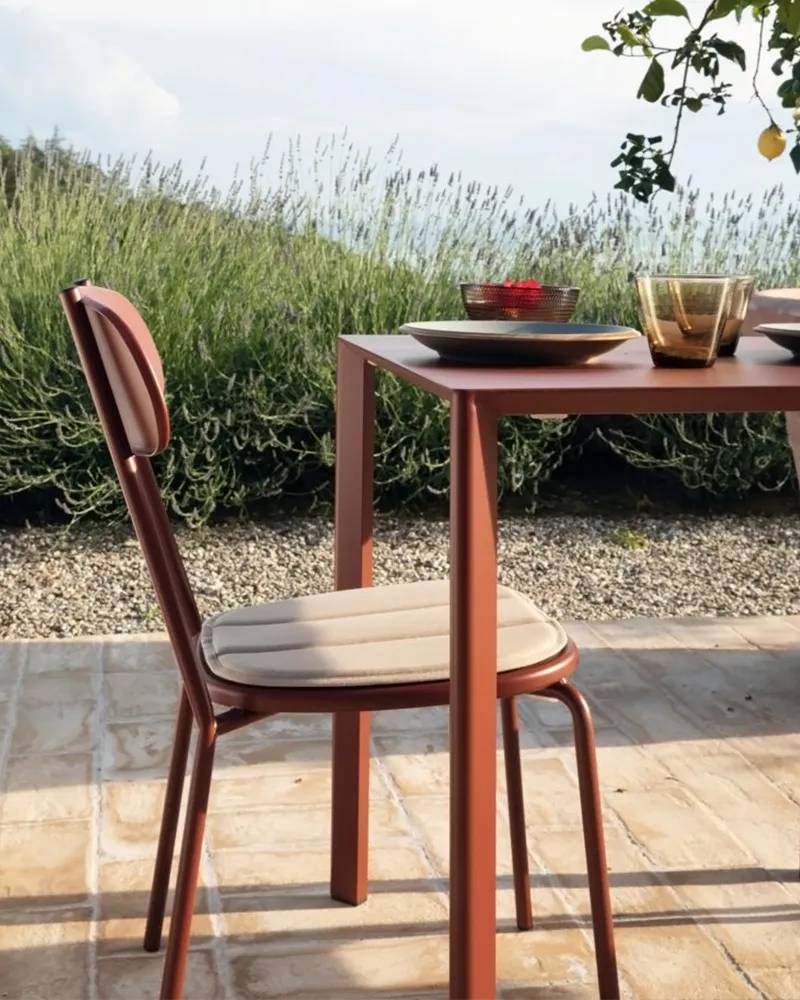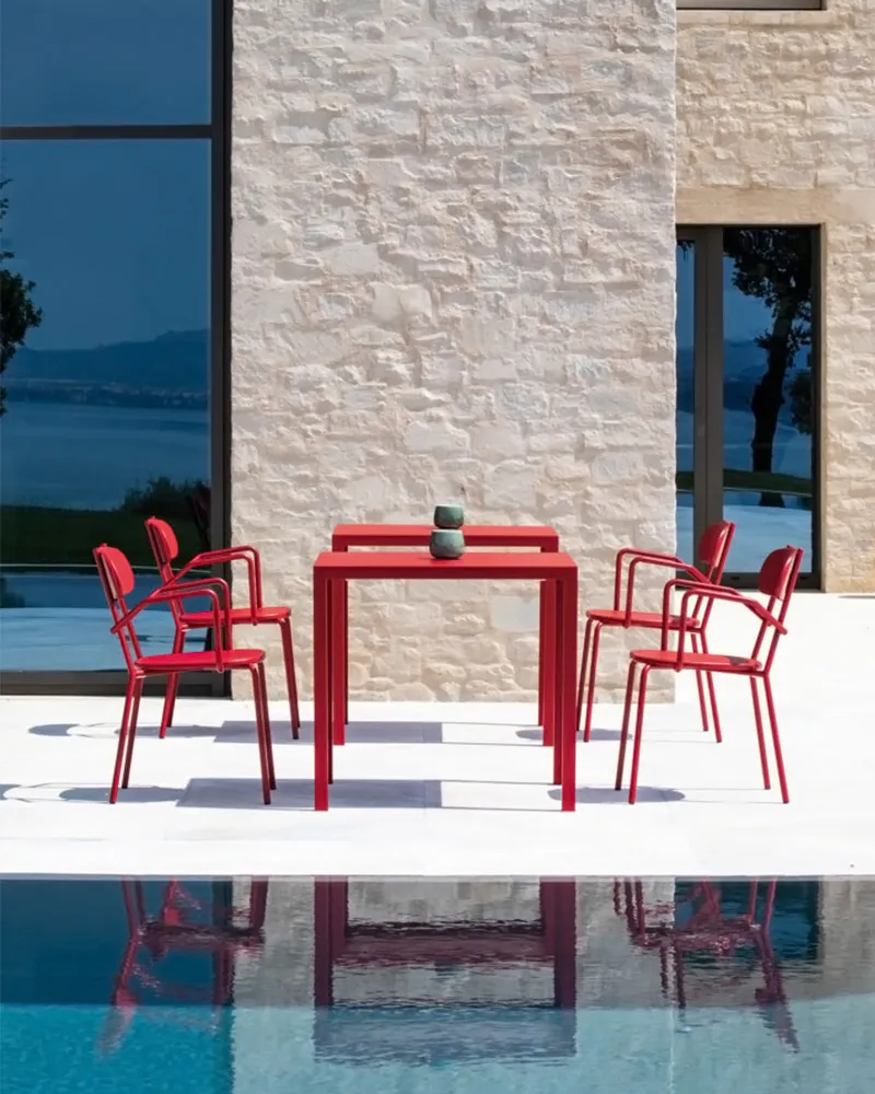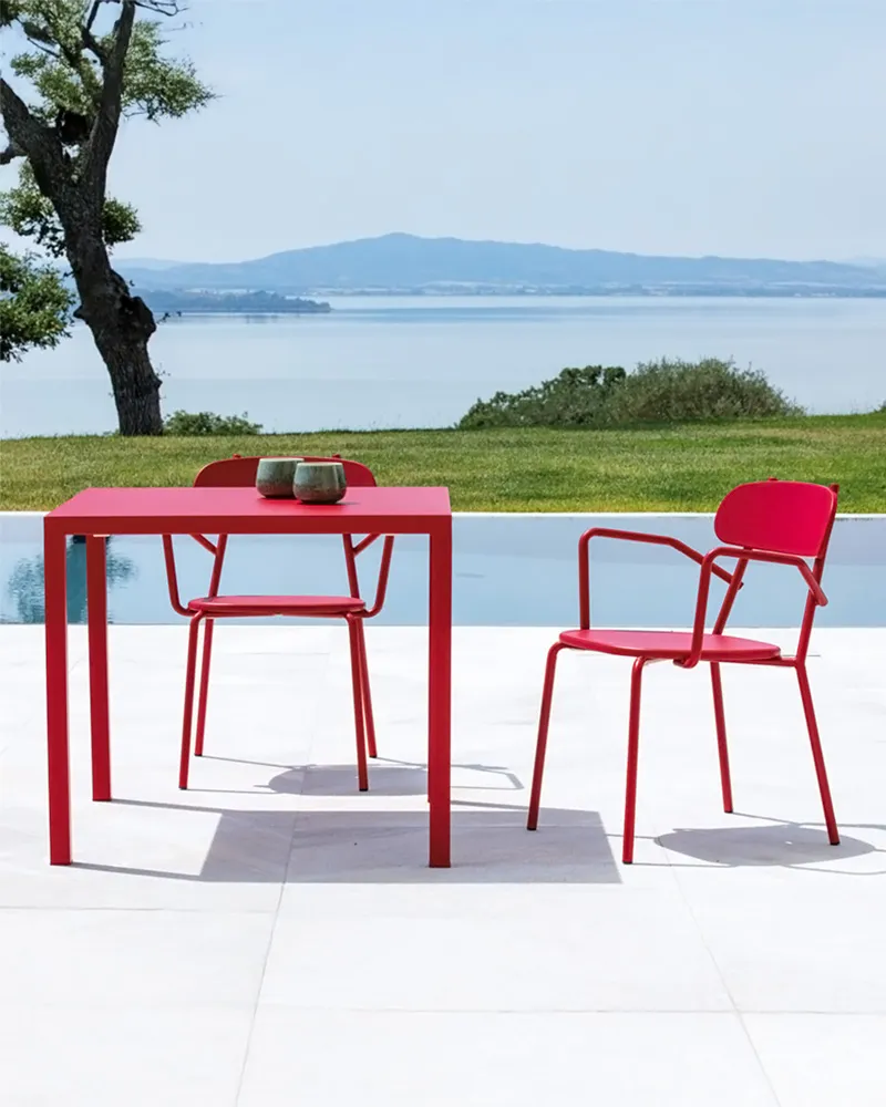 Piano quadrato da 80×80 cm, design moderno ed essenziale, pensato per ambienti contract e outdoor ad alto utilizzo.