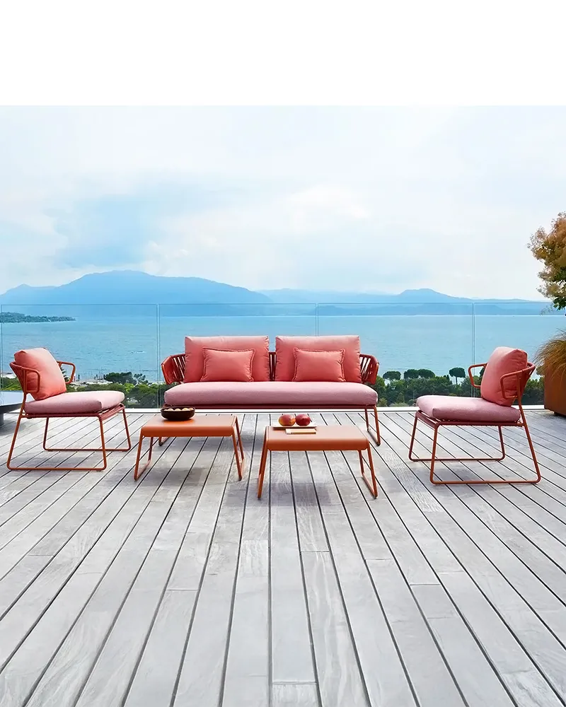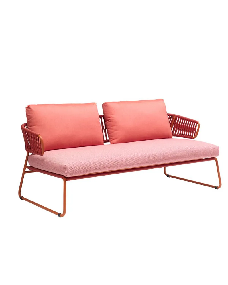 Haze è un divano che propone una seduta elegante per l’outdoor, con telaio metallico a slitta che garantisce stabilità e schienale intrecciato in estruso di PVC. I cuscini, generosi e resistenti alle intemperie, offrono comfort prolungato. Una soluzione raffinata per lounge, terrazze e spazi contract contemporanei.