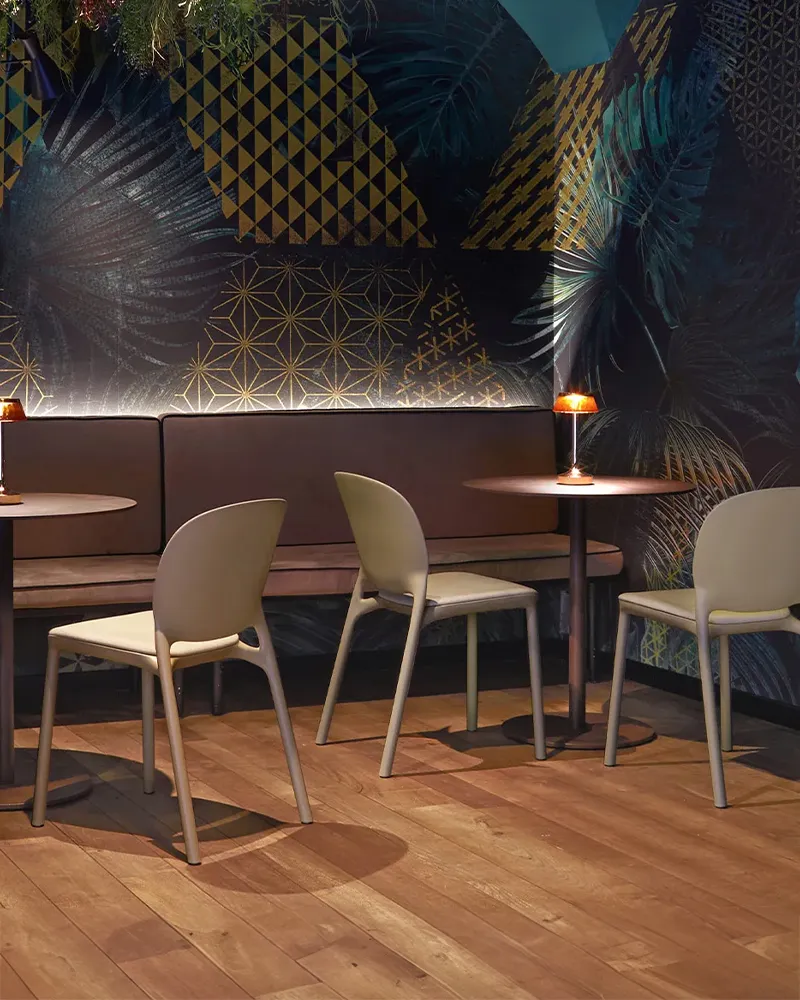 Impilabile fino a 8 unità, è proposta anche con cuscino fisso idrorepellente, ideale per ambienti contract ad alto utilizzo. Adatta per interni, realizzata con materiali resistenti e facili da pulire. Perfetta per bar, ristoranti, lounge e spazi hospitality contemporanei.