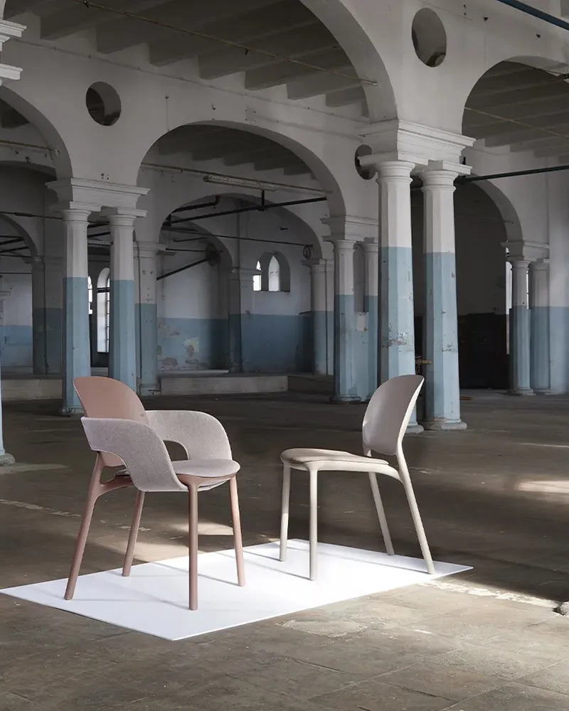 La poltroncina Hug c/c presenta un design morbido e avvolgente, ripensato in chiave sostenibile. La scocca in tecnopolimero – disponibile anche nella versione eco Go Green a base di materiale rigenerato – presenta una fascia in rilievo che unisce seduta e schienale con un effetto “abbraccio”.