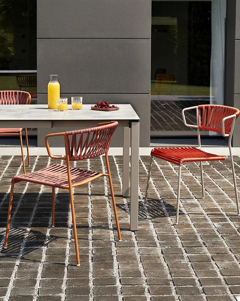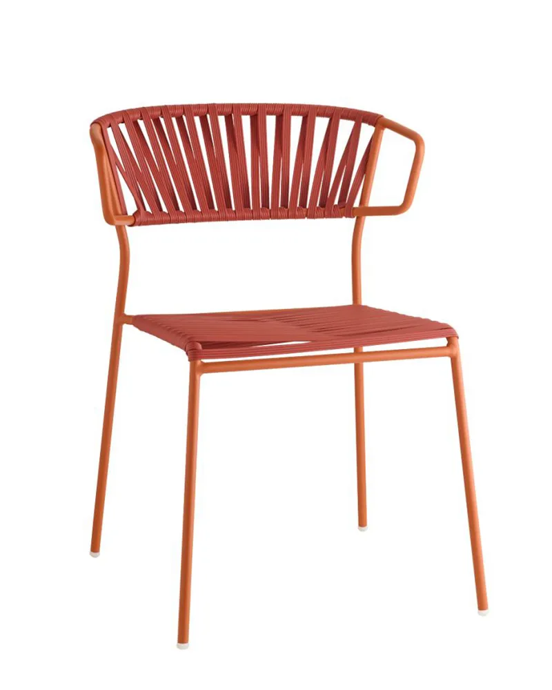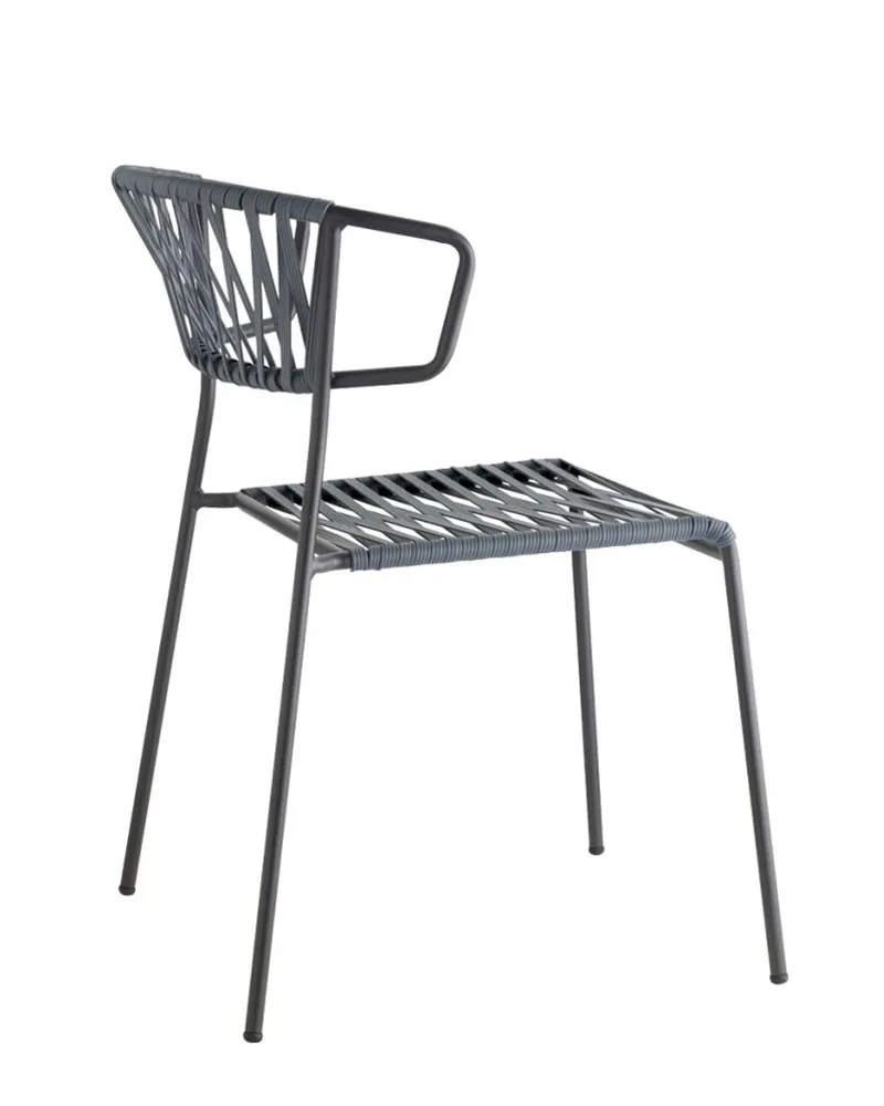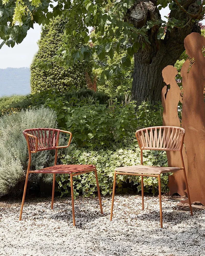 Lisa Filò interpreta l’estetica anni ’50-’60 con una struttura in acciaio zincato e verniciato e un intreccio in estruso di PVC con anima in nylon. Leggera, impilabile e dotata di braccioli, offre un comfort superiore ed è ideale per terrazze, dehor, beach club e ambienti interni informali dallo stile ricercato.