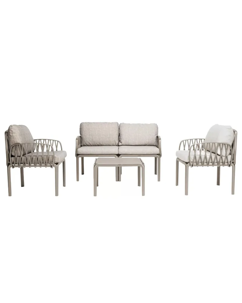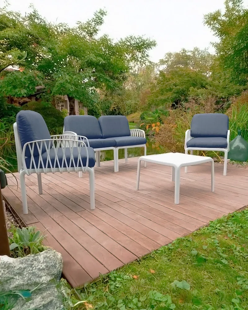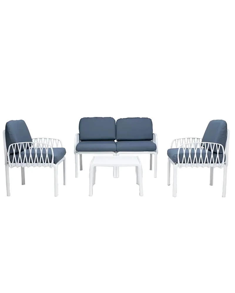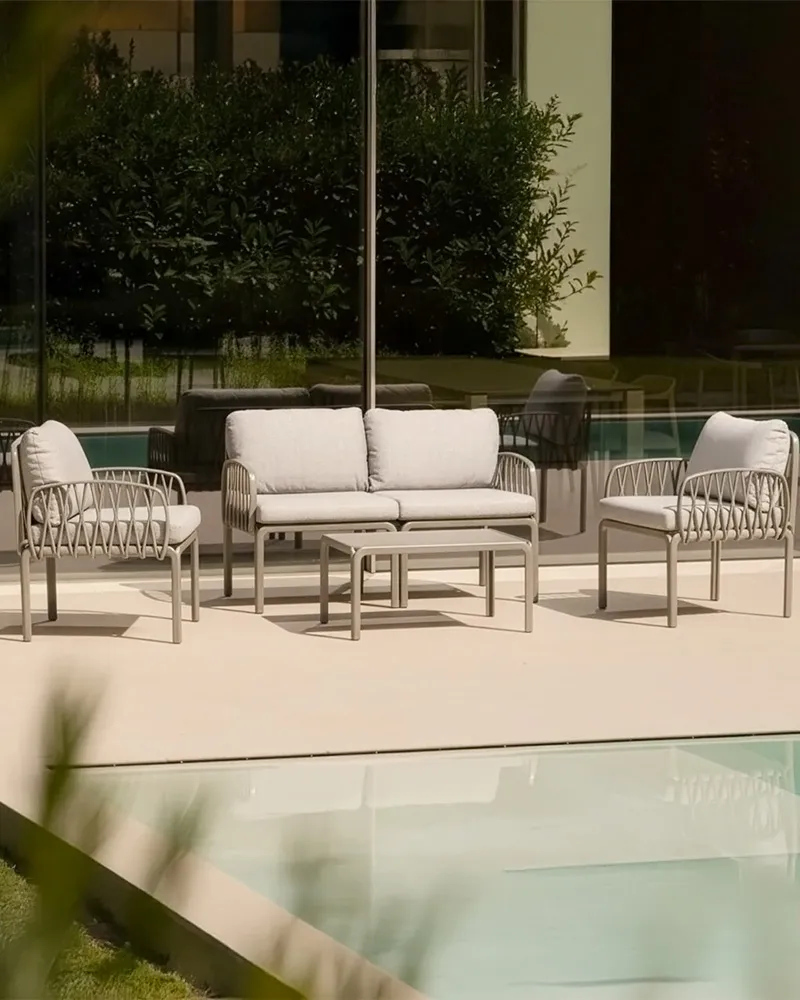 Il Set Lumiere, composto da due poltrone, un divano a due posti e un tavolino, è realizzato in polipropilene e fiberglass con trattamento anti-UV, materiali che garantiscono resistenza e lunga durata all’esterno. Il design moderno ed elegante, unito alla qualità Made in Italy, lo rende ideale per terrazze, giardini e spazi contract. I cuscini in policotone resistente all’acqua assicurano comfort e praticità. È perfetto per ambienti outdoor contemporanei.