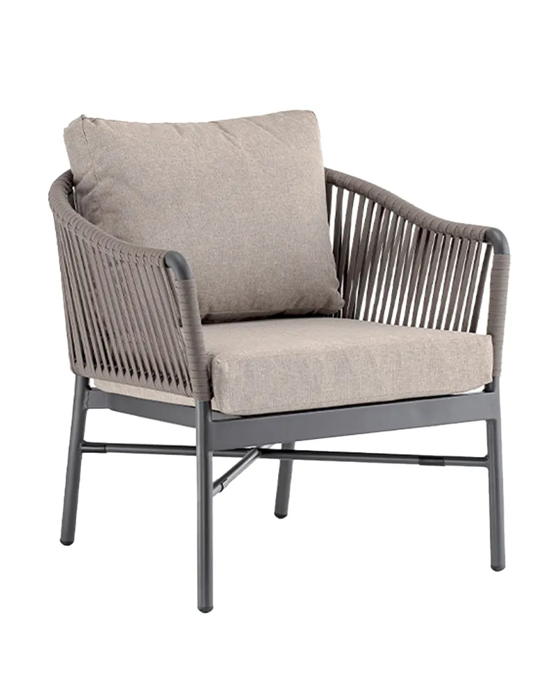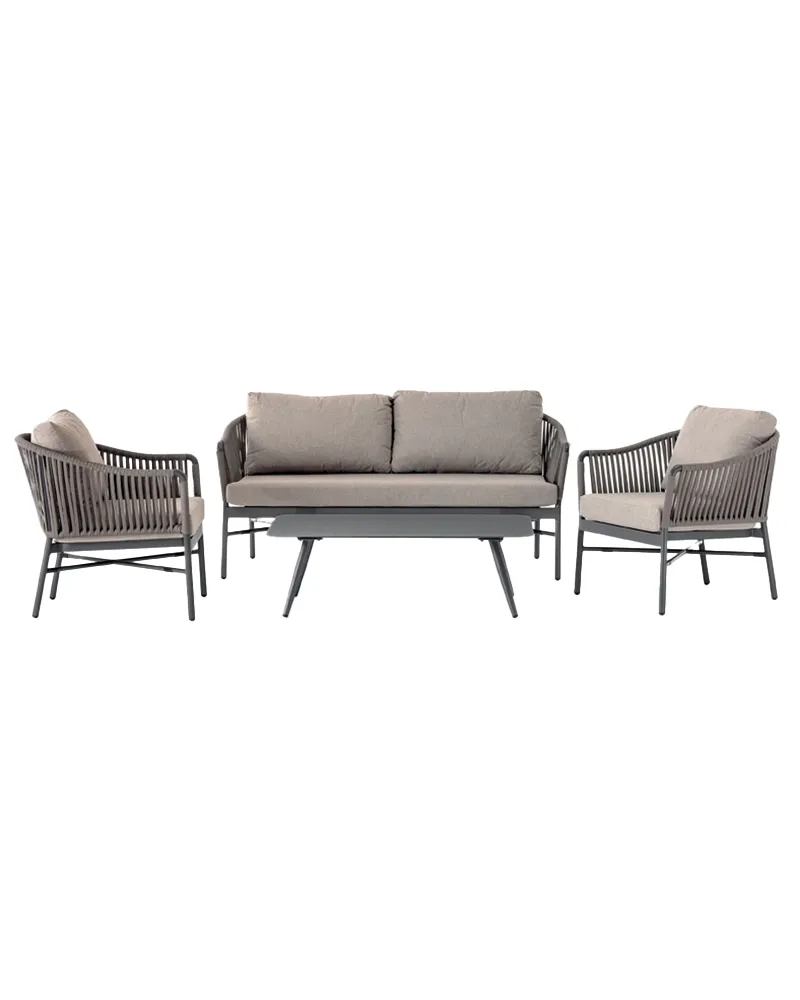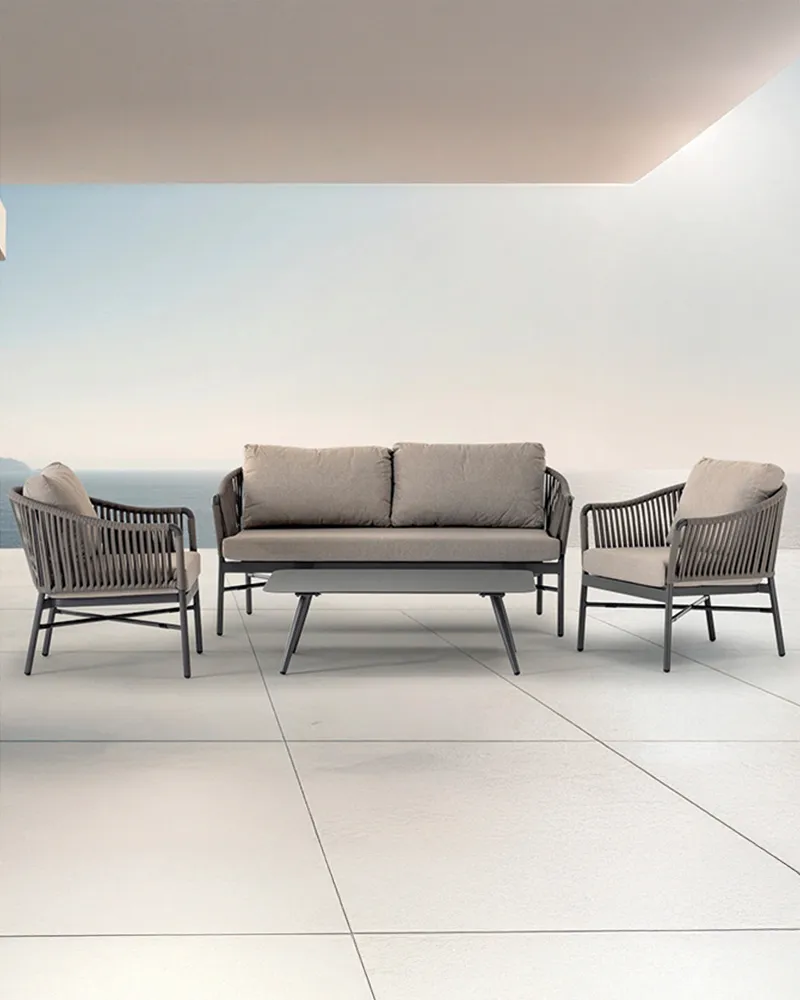 Il set Mirò offre un design leggero e impilabile, con struttura in alluminio e rivestimento in corda textilene. Composto da un divano a due posti, due poltrone e un tavolino con piano in alluminio, garantisce durata e praticità. La cuscineria sfoderabile in tessuto Olefin idrorepellente assicura comfort e prestazioni ottimali per l’outdoor contract.