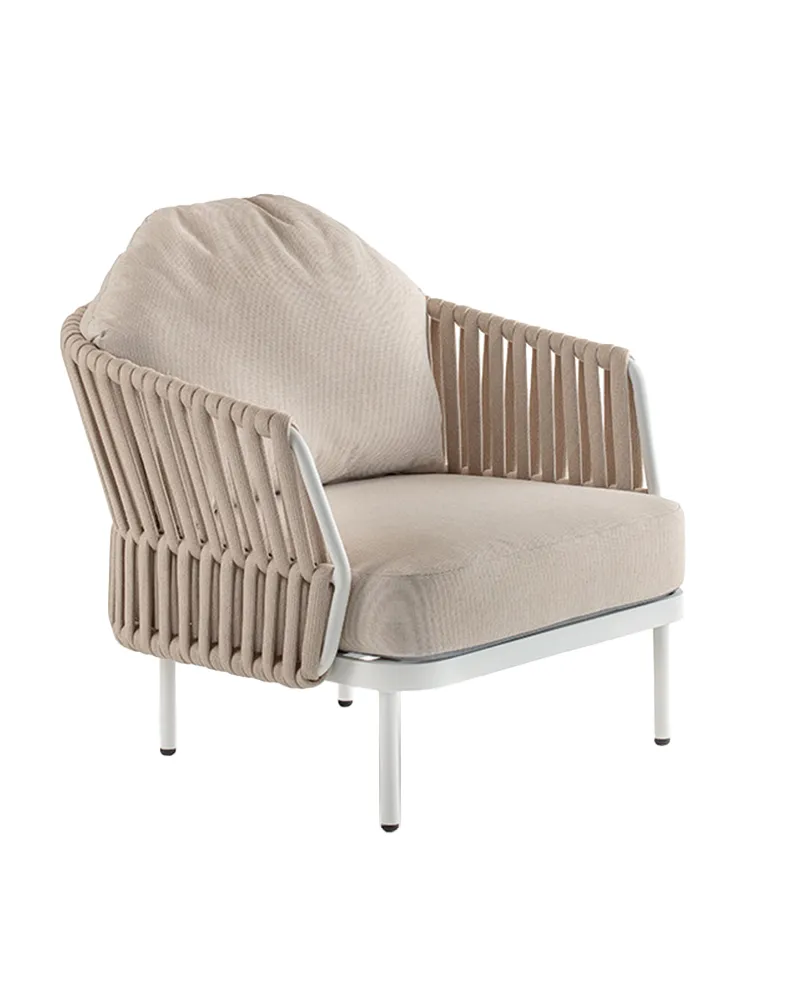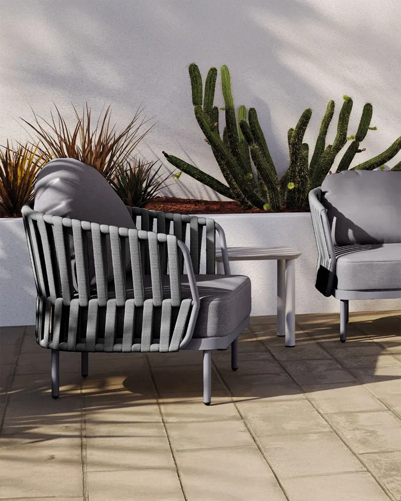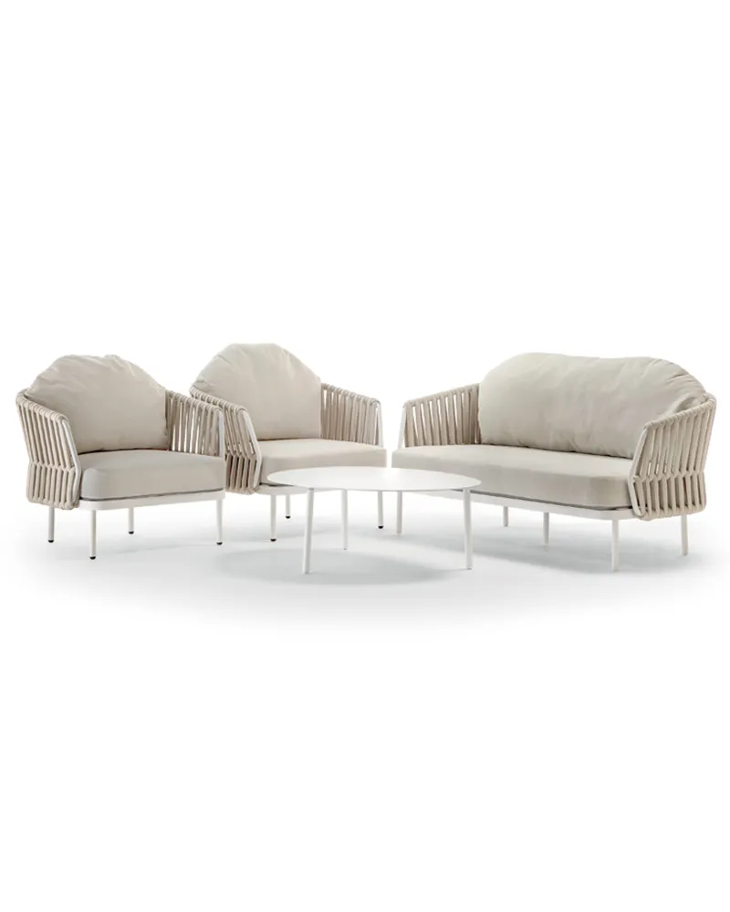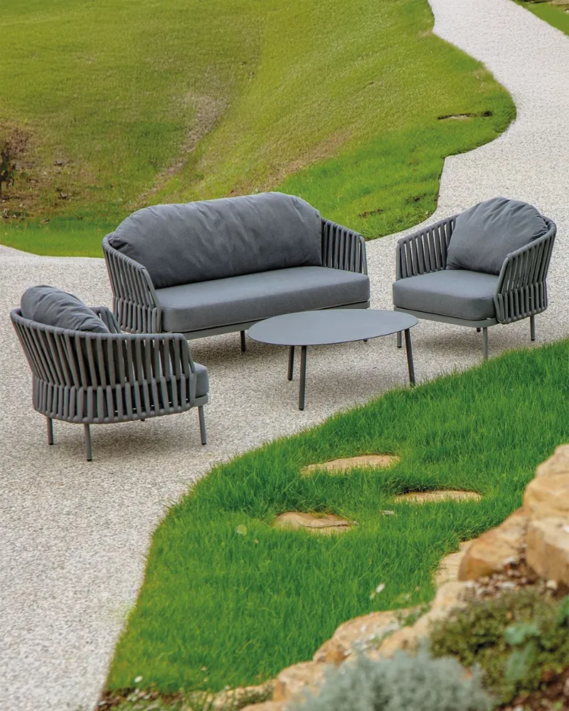 Il set Nebel presenta una struttura in alluminio con rivestimento in tessuto poliestere e gomma. È composto da un divano, due poltrone e un tavolino con piano in alluminio. La cuscineria sfoderabile in tessuto Olefin idrorepellente lo rende ideale per terrazze, lounge e aree esterne ad uso professionale.