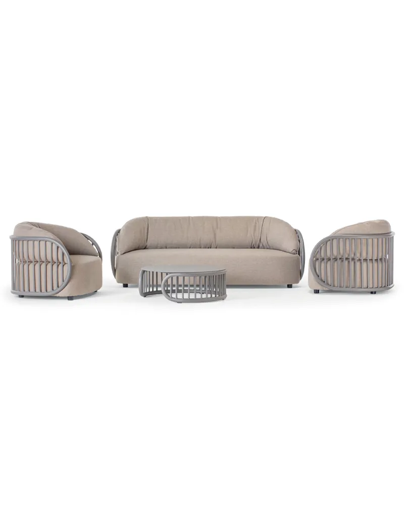 Il set Onice combina una struttura in alluminio con un design essenziale e contemporaneo. Comprende due poltrone, un divano e un tavolino con piano in alluminio. La cuscineria in tessuto Olefin, abbinata alla gomma rivestita da tessuto plastico impermeabile, offre resistenza agli agenti atmosferici e comfort quotidiano. Ideale per terrazze, giardini e aree lounge.