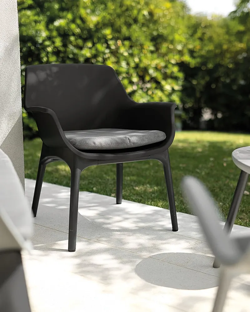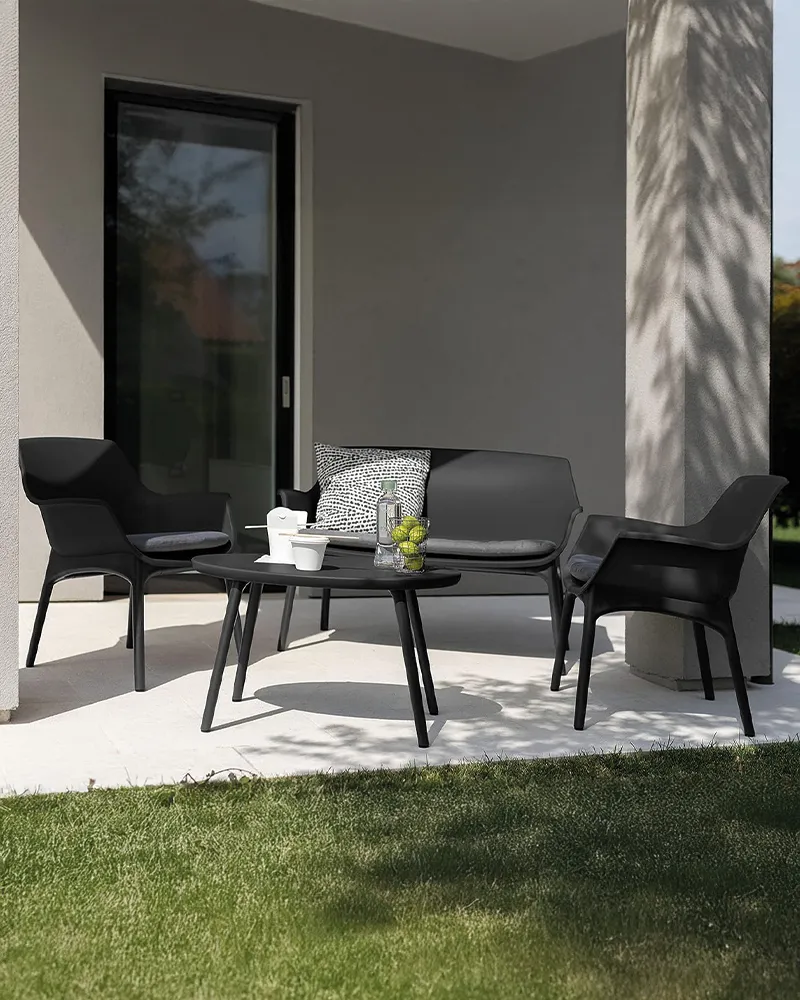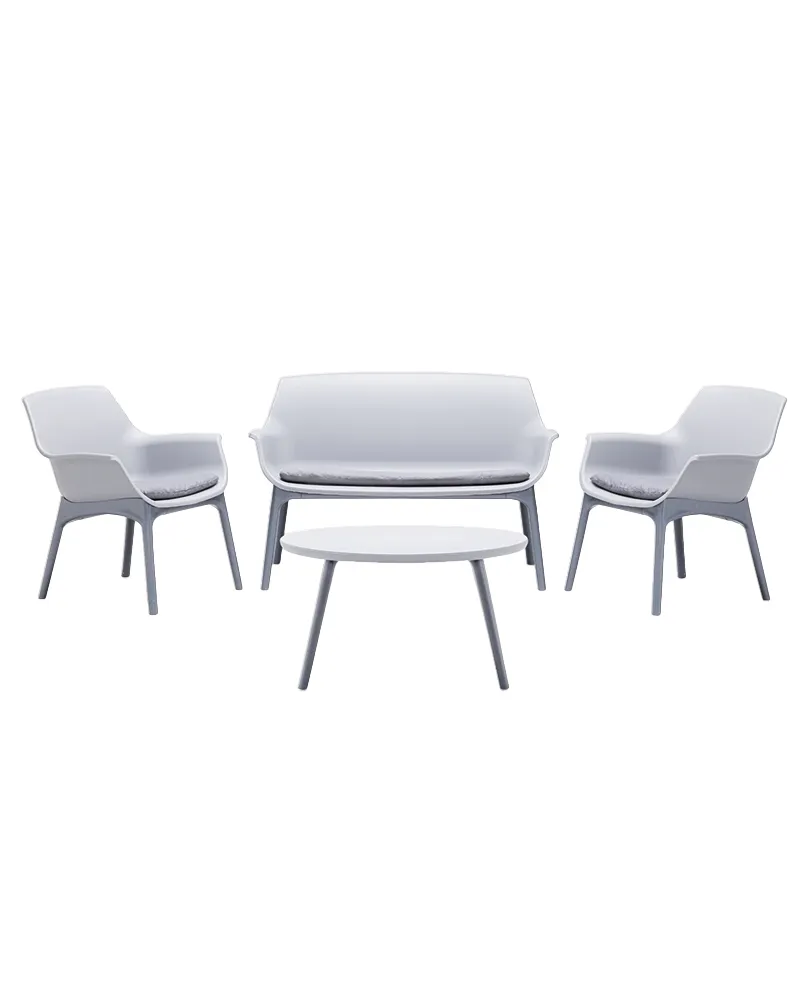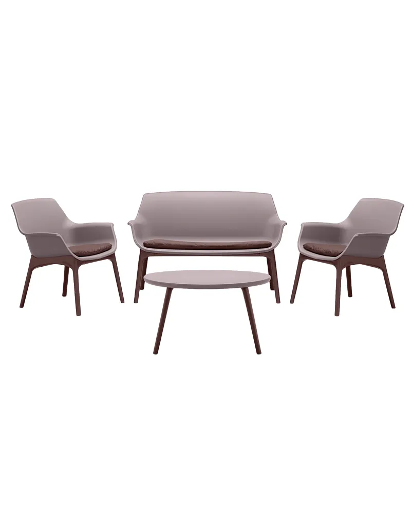 Il Set Rubino è composto da due poltrone, un divano a due posti e un tavolino, tutti realizzati in polipropilene. Impermeabile, resistente alle macchie e progettato con schienale alto ed ergonomico, garantisce comfort e durabilità. È ideale per giardini, bar, piscine e locali outdoor.