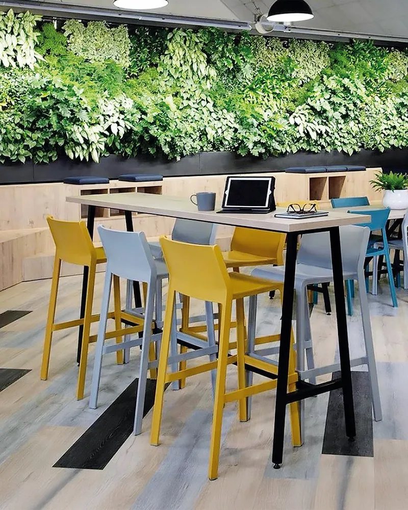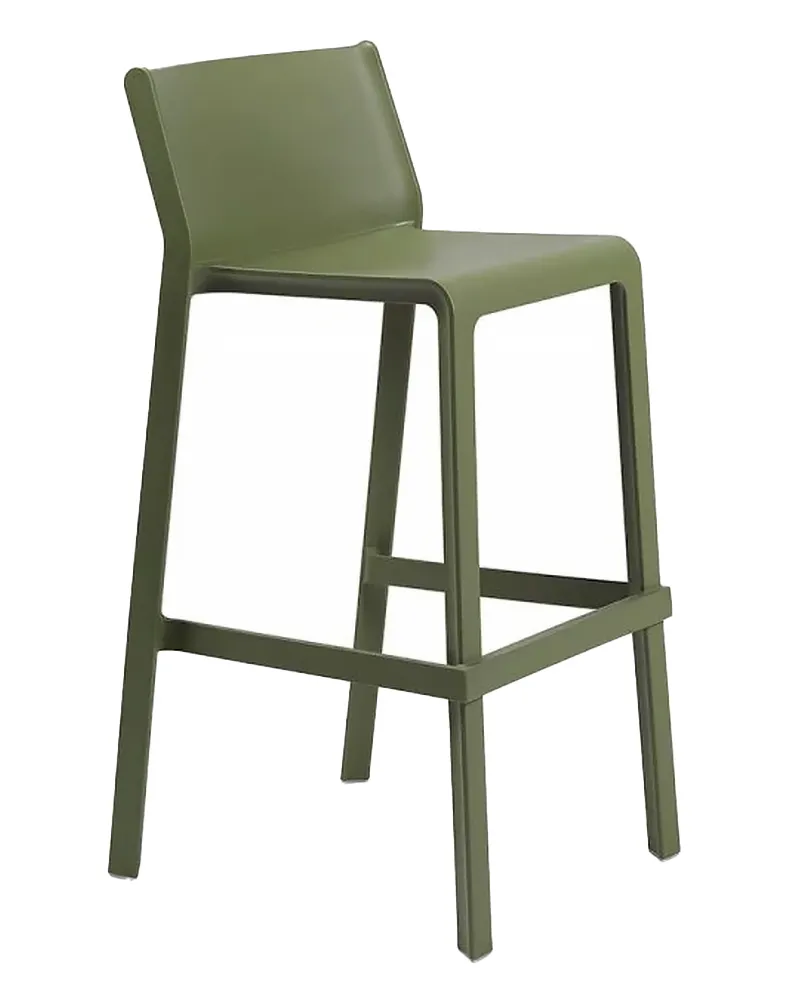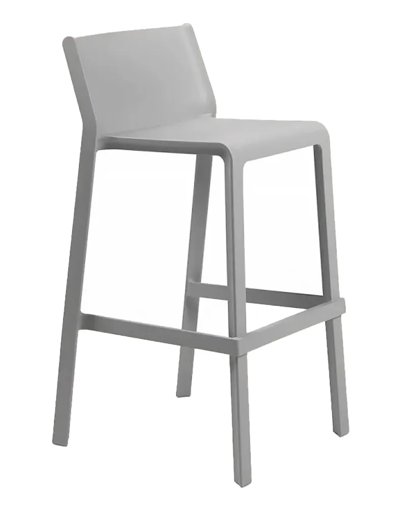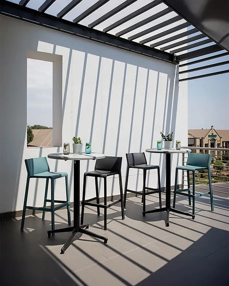 Sensia è uno sgabello monoblocco in polipropilene fiberglass colorato in massa con trattamento anti-UV. Il design lineare e il poggiapiedi integrato lo rendono comodo, impilabile e ideale per bar, terrazze e spazi outdoor.