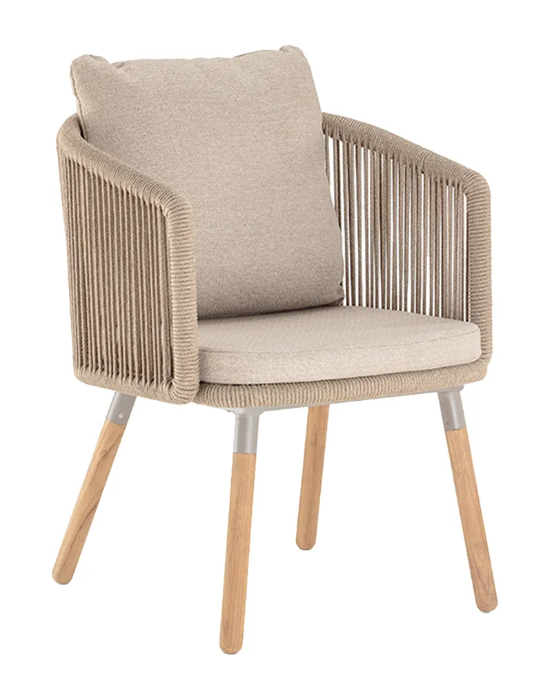 La poltroncina Welle abbina eleganza e comfort con una struttura in alluminio verniciato, gambe in teak e seduta in corda, poliestere intrecciata. La cuscineria sfoderabile in tessuto acrilico aggiunge morbidezza e resistenza. Ideale per lounge, terrazze e aree relax dall’estetica naturale e ricercata.